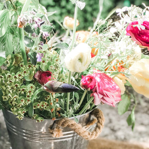 As instructed I left my bucket of water on my doorstep Friday morning which Cissy then filled with the most glorious array of flowers and foliage including some amazing ranunculus.