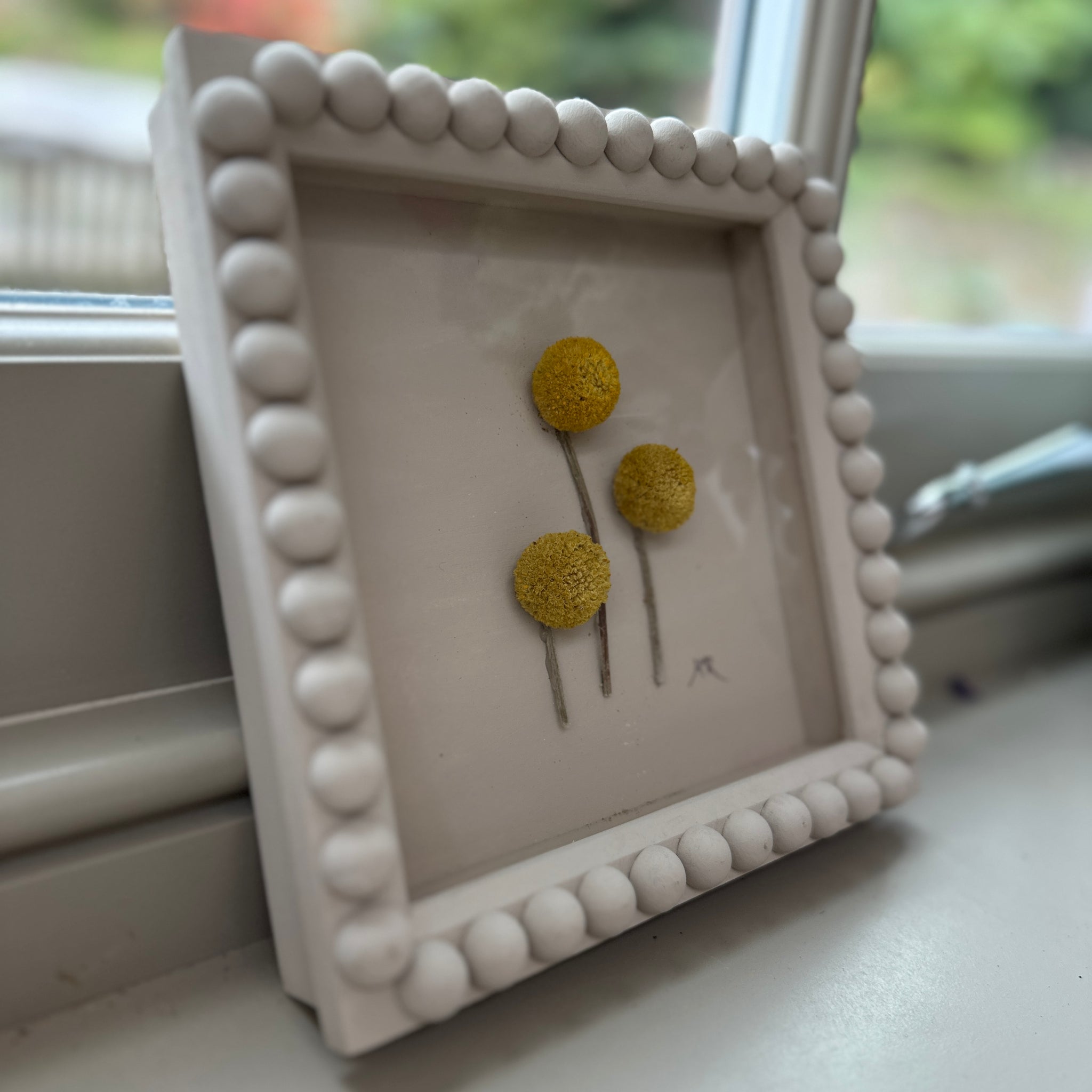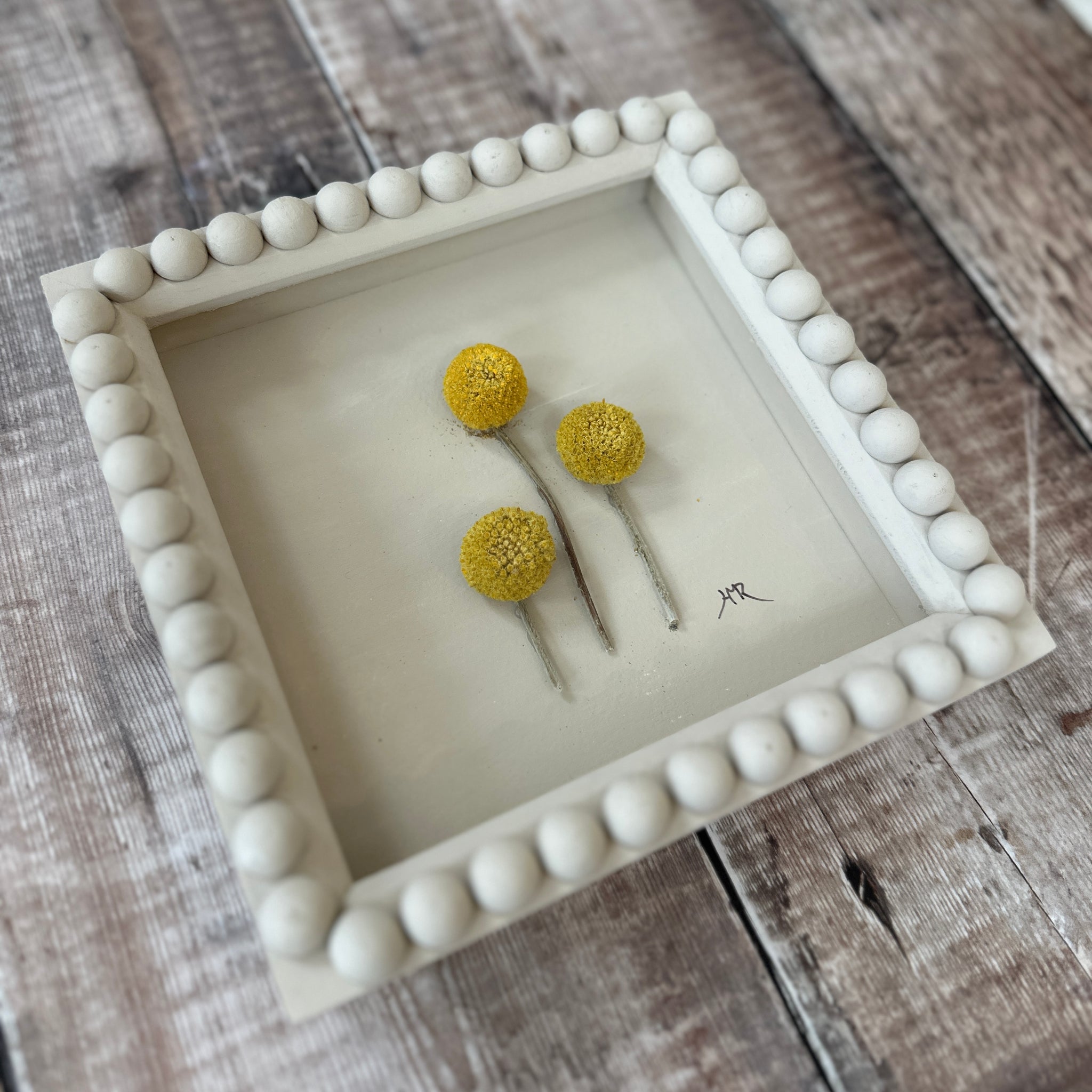 This unique work of art contains three billy buttons gently preserved in a hand crafted wooden bobbin frame which has been hand painted with a chalk paint finish.